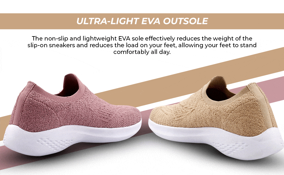 - ULTRA-LIGHT EVA OUTSOLE: The non-slip and lightweight EVA sole effectively reduces the weight of the slip-on sneakers and reduces the load on your feet, allowing your feet to stand comfortably all day. EVA material is odourless and tough, with excellent durability.