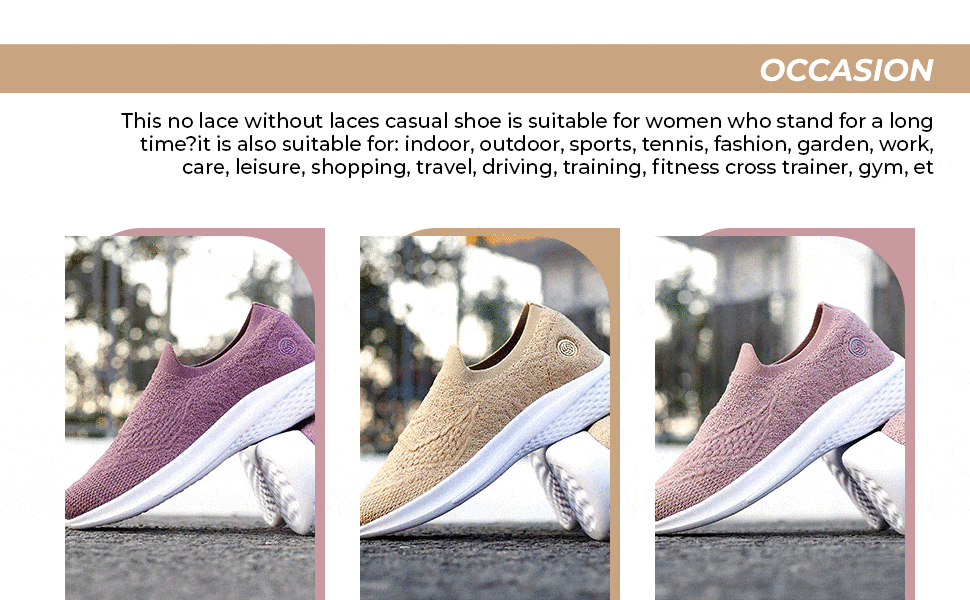 - OCCASION: This no lace without laces casual shoe is suitable for women who stand for a long time?it is also suitable for: indoor, outdoor, sports, tennis, fashion, garden, work, care, leisure, shopping, travel, driving, training, fitness cross trainer, gym, etc.