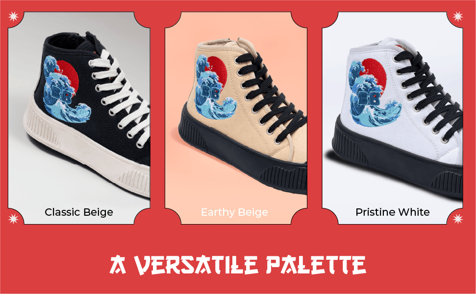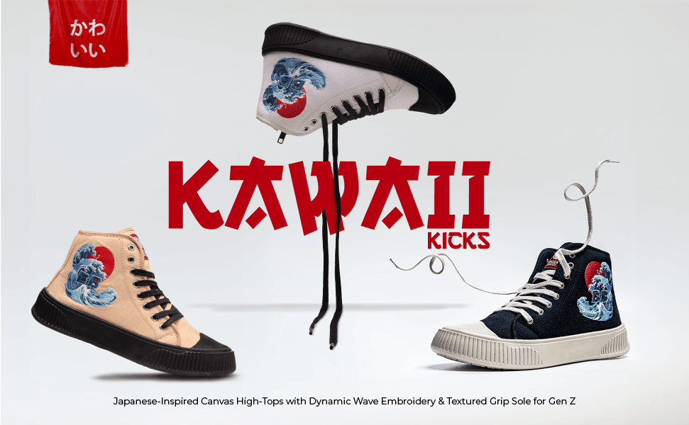- Japanese Artistry in Every Step: The "Kawaii Kicks" high-top sneakers from Bacca Bucci beautifully blend traditional Japanese art with contemporary sneaker design. The wave pattern in vivid shades of blue, inspired by the iconic "Great Wave off Kanagawa," sweeps across the canvas, creating a dynamic and powerful visual statement that resonates with the cultural depth and elegance of Japan.
