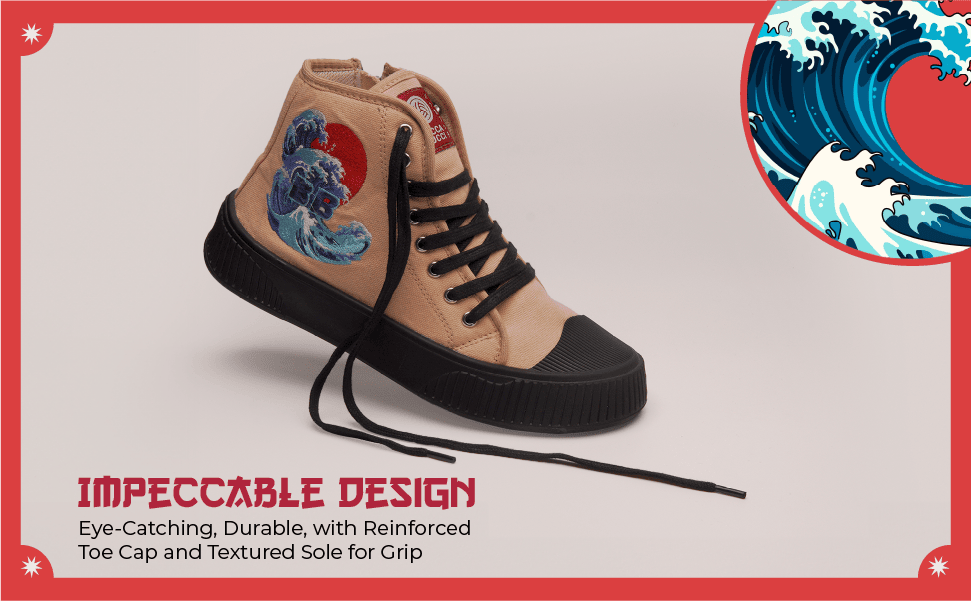 Japanese-Inspired Canvas High-Tops with Dynamic Wave Embroidery & Textured Grip Sole for Gen Z