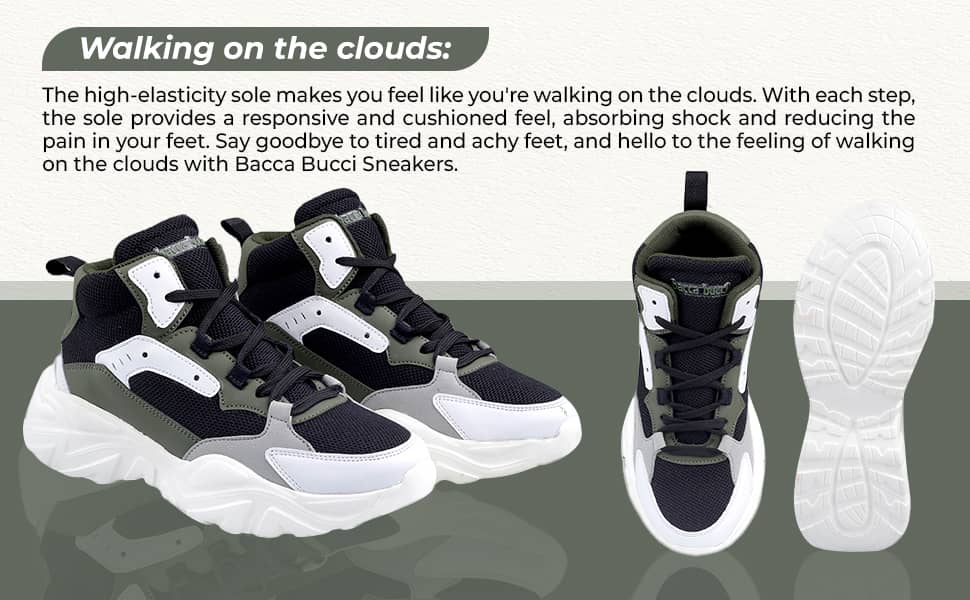 - Walking on the clouds: The high-elasticity sole makes you feel like you're walking on the clouds. With each step, the sole provides a responsive and cushioned feel, absorbing shock and reducing the pain in your feet. Say goodbye to tired and achy feet, and hello to the feeling of walking on the clouds with Bacca Bucci Sneakers.