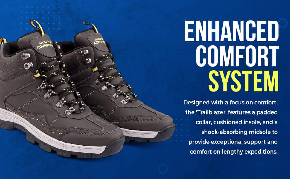- Enhanced Comfort System: Designed with a focus on comfort, the 'Trailblazer' features a padded collar, cushioned insole, and a shock-absorbing midsole to provide exceptional support and comfort on lengthy expeditions.