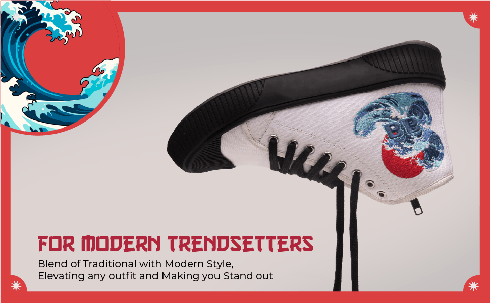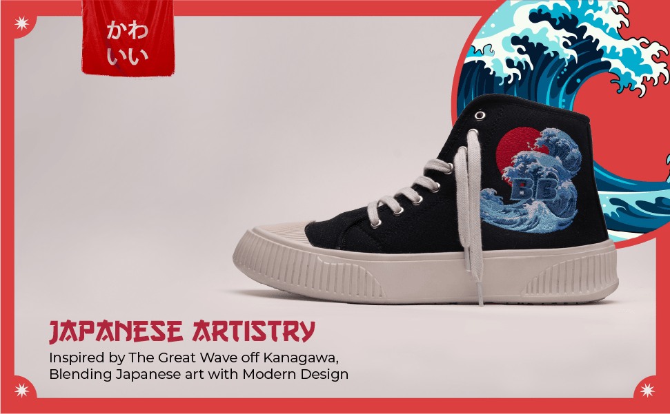 - Japanese Artistry in Every Step: The "Kawaii Kicks" high-top sneakers from Bacca Bucci beautifully blend traditional Japanese art with contemporary sneaker design. The wave pattern in vivid shades of blue, inspired by the iconic "Great Wave off Kanagawa," sweeps across the canvas, creating a dynamic and powerful visual statement that resonates with the cultural depth and elegance of Japan.