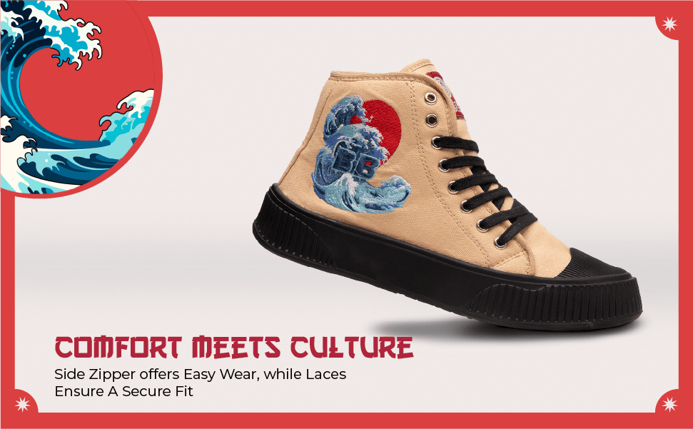 Japanese-Inspired Canvas High-Tops with Dynamic Wave Embroidery & Textured Grip Sole for Gen Z